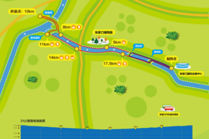 21公里路线:张家口国际会展中心-沿清水河西岸-名湖公园-清水河南桥折返至清水河东岸-沿清水河东岸-新垣桥至清水河西岸-张家口国际会展中心