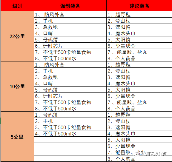 2、本次21公里和10公里参赛者必须携带以下装备,5公里选手建议携带一下装备: