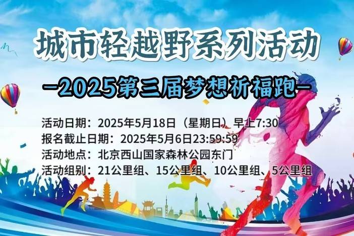 活动信息☆活动名称城市轻越野系列活动-2025第三届梦想祈福跑☆活动日期2025年5月18日(星期日)早上7:30☆报名截止日期2025年5月6日23:59:59名额有限,报满为止☆早鸟价日期即日起至2025年4月18日23:59:59☆活动起点北京西山国家森林公园东门☆活动规模:500人☆ITRA积分本次活动正在申请ITRA积分赛事认证。待申请完成后,参赛选手在规定时间内完赛即可获得相应的ITRA积分。 21公里组(ITRA积分1分) 参赛选手报名成功后,因...